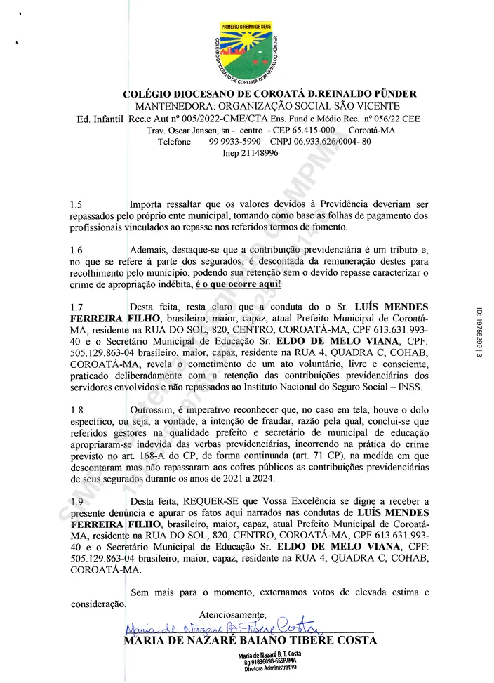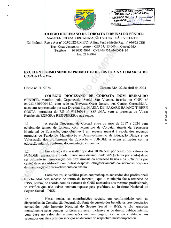 A denúncia foi recebida oficialmente pelo protocolo das Promotorias de Justiça da Comarca de Coroatá no dia 26 de abril de 2024 e é assinada por Maria de Nazaré Baiano Tibere Costa, diretora administrativa da escola, mantida pela Organização Social São Vicente.