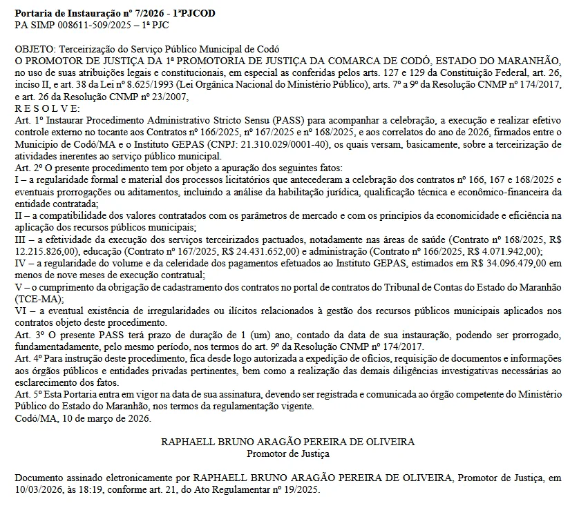 O Ministério Público do Estado do Maranhão (MPMA) instaurou um procedimento administrativo para acompanhar e fiscalizar contratos de terceirização firmados na gestão do Chiquinho Oliveira na Prefeitura de Codó com o Instituto GEPAS. A medida foi oficializada por meio da Portaria de Instauração nº 7/2026, assinada pelo promotor de Justiça Raphaell Bruno Aragão Pereira de Oliveira, da 1ª Promotoria de Justiça da comarca.