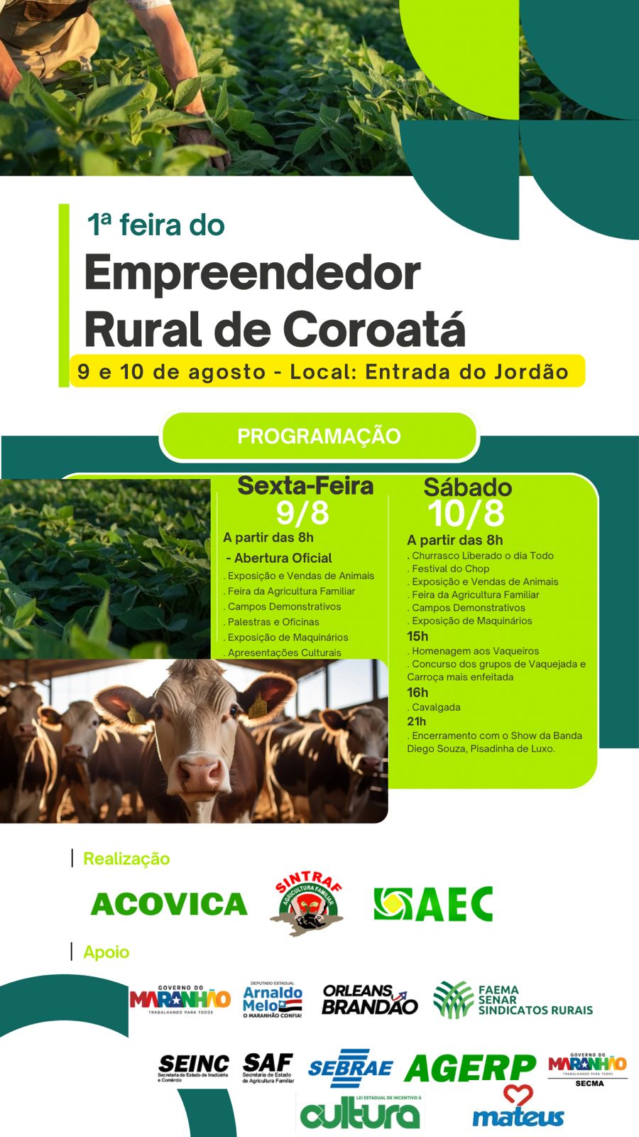 Coroatá se prepara para a sua primeira Feira do Empreendedor Rural, marcada para os dias 9 e 10 de agosto. O evento, que promete ser um ponto de encontro importante para agricultores, produtores e membros da agricultura familiar, será realizado na entrada do Jordão, com uma ampla programação voltada para o setor rural.