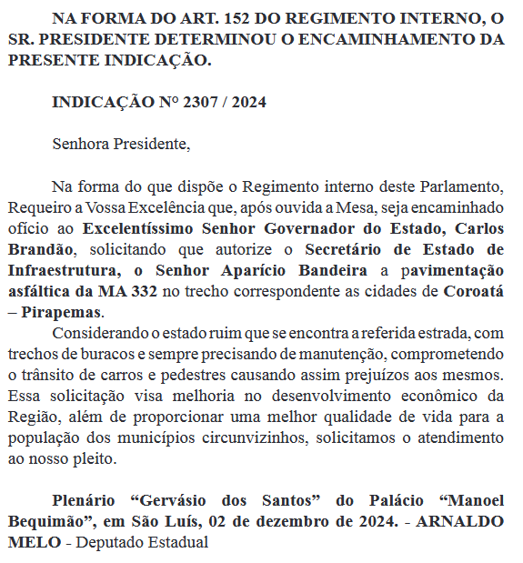 O deputado estadual Arnaldo Melo (MDB) atendeu a um pedido do prefeito eleito de Coroatá, Edimar Vaqueiro, ao apresentar a Indicação 2307/2024, solicitando ao governo estadual a pavimentação asfáltica da MA-332. A rodovia, que liga Coroatá a Pirapemas, encontra-se em condições precárias, prejudicando o trânsito de veículos, a segurança de pedestres e causando prejuízos à população local.
