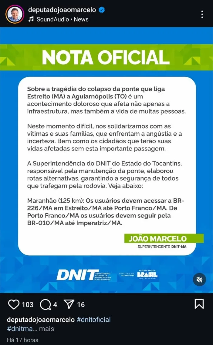 A Superintendência do Departamento Nacional de Infraestrutura de Transportes (DNIT) no Maranhão, liderada pelo ex-deputado federal João Marcelo, divulgou uma nota oficial nas suas redes sociais neste domingo (22) sobre o desabamento da ponte que conecta Estreito (MA) a Aguiarnópolis (TO), na BR-010.