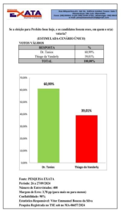 No cenário espontâneo, a vantagem de Dr. Tânios se mantém, com 56,2% das preferências, em comparação a 34,7% para Thiago. As opções “nenhum” e “não sabe” somam, respectivamente, 1,2% e 7,7% dos entrevistados, indicando uma margem de indecisão entre os eleitores.