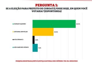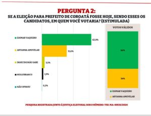 Ao considerar apenas os votos válidos, a vantagem de Edimar se amplia, atingindo 66%, enquanto Aryanna fica com 34%. Os resultados refletem a liderança consolidada de Edimar, que encabeça a coligação “Coroatá Quer Mudança”, formada por PSB, PRD, União Brasil, Cidadania e PSDB. A pesquisa ainda aponta que 3,5% dos entrevistados estão indecisos, e 1,9% optaram por “Nulo/Branco”.