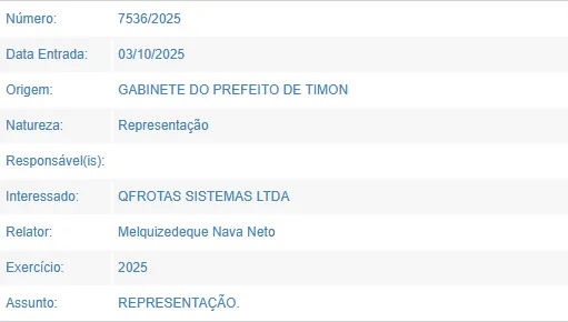 A QFrotas Sistemas Ltda protocolou denúncia com pedido de medida cautelar no Tribunal de Contas do Estado do Maranhão (TCE-MA) contra o Pregão Eletrônico SRP nº 009/2025, da Prefeitura de Timon, que tem como objeto o gerenciamento da frota municipal — incluindo abastecimento, manutenção preventiva e corretiva e fornecimento de peças. O edital estima um gasto total de R$ 26.575.653,00, sendo R$ 15.016.053,00 destinados ao gerenciamento de combustível (2,1 milhões de litros) e R$ 11.559.600,00 para gerenciamento de manutenção