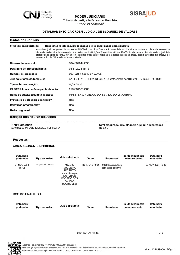 Atualmente, o réu está **sob execução de penhora de valores** para sanar o débito determinado pela Justiça. Para garantir o cumprimento da sentença, foram expedidas **duas ordens judiciais de bloqueio** nas contas bancárias de Luís Mendes Ferreira, no valor total atualizado de R$ 1.124.974,94. As tentativas de bloqueio ocorreram entre os dias 07 de outubro e 4 de novembro, utilizando o sistema Sisbajud, mas resultaram em resposta negativa devido à insuficiência de saldo nas contas do ex-prefeito. No entanto, parte do valor (R$ 345,70) chegou a ser bloqueada em uma das execuções, evidenciando a persistência da Justiça na busca pelo ressarcimento ao erário.