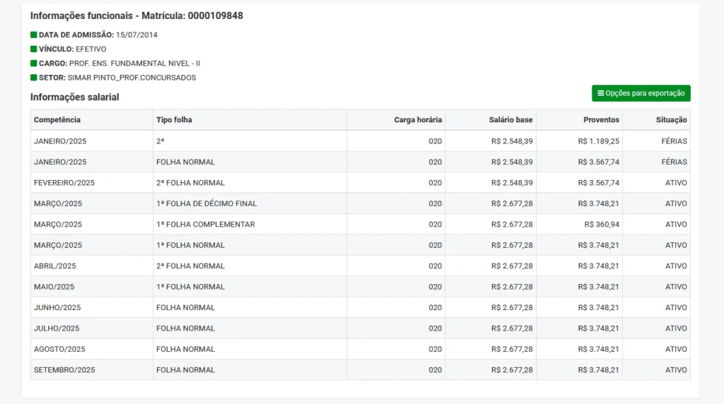 - Indícios de Ausência Laboral: Diligências in loco na escola municipal indicaram que o servidor não exerce a docência regular desde 2024. Livros e espelhos de ponto de 2025, embora o citem, estariam sem assinaturas, apesar de resumos de frequência o listarem como ativo.