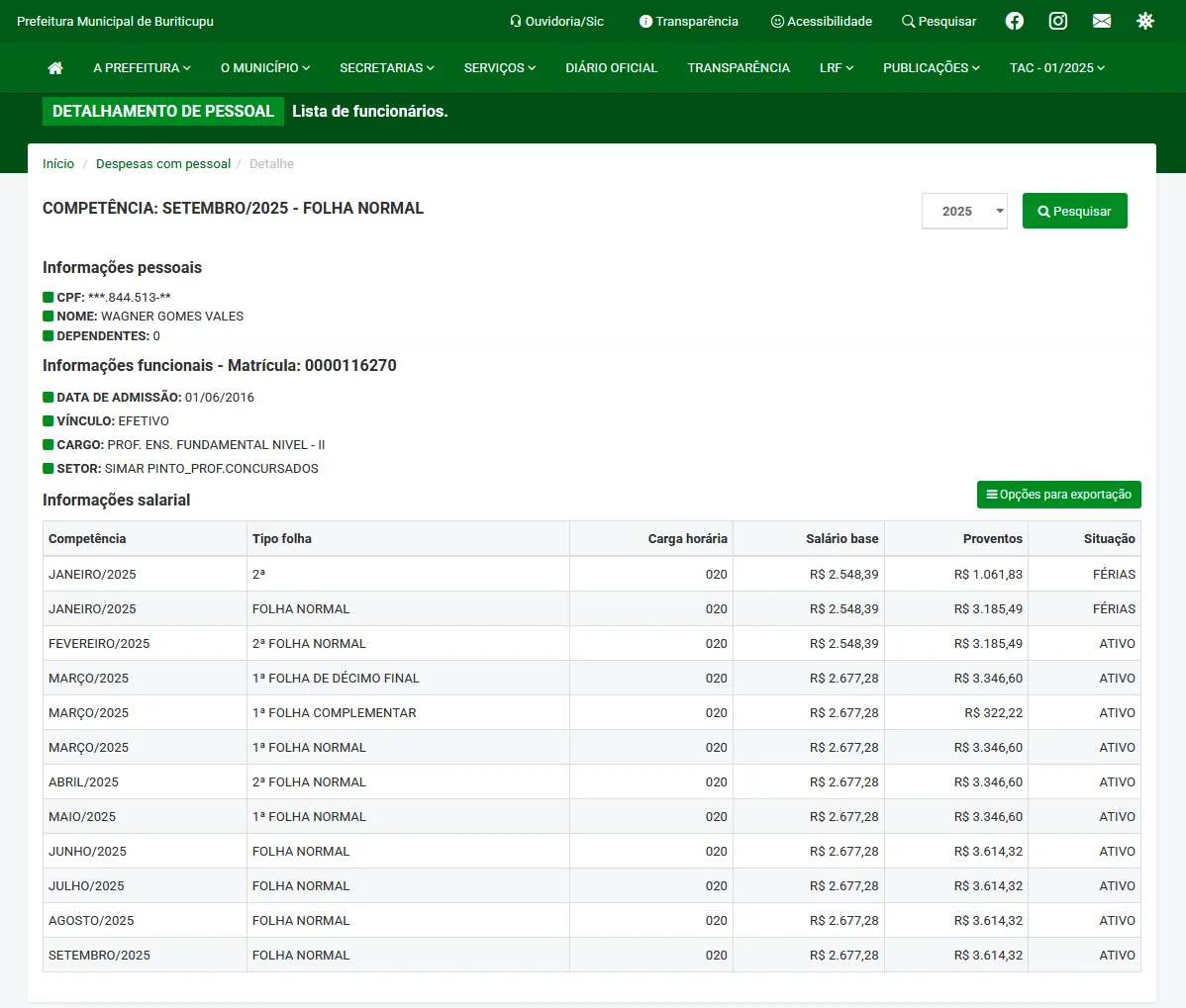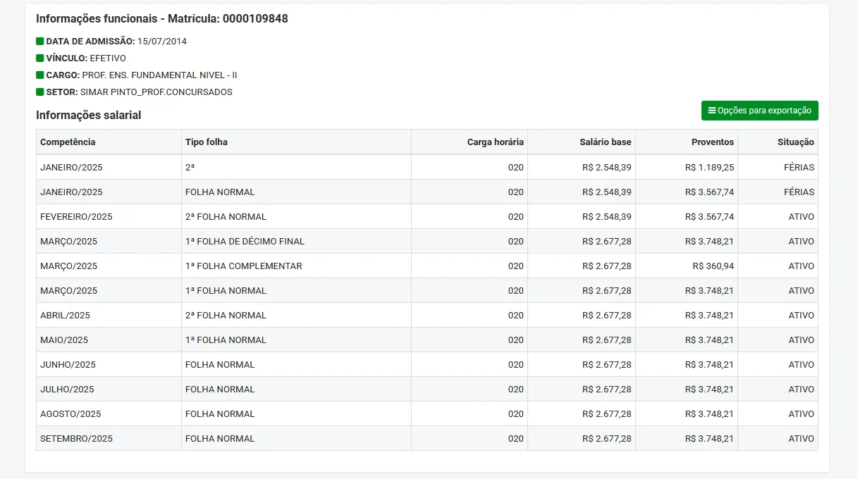 - Indícios de Ausência Laboral: Diligências in loco na escola municipal indicaram que o servidor não exerce a docência regular desde 2024. Livros e espelhos de ponto de 2025, embora o citem, estariam sem assinaturas, apesar de resumos de frequência o listarem como ativo.
