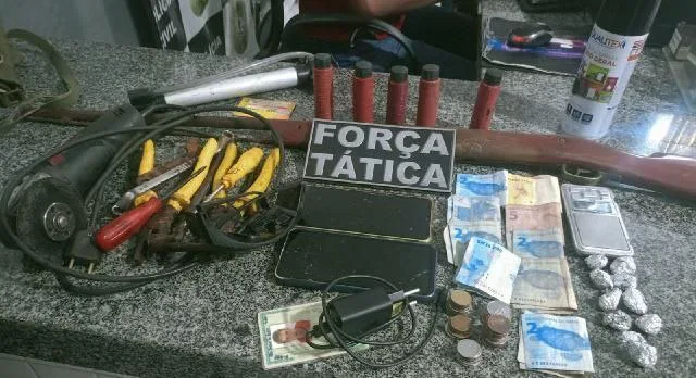 Durante a abordagem, foram apreendidos diversos materiais com os suspeitos: uma motocicleta preta com o chassi suprimido e número de motor final 7738, dois celulares, uma arma de fogo de fabricação artesanal (“por fora”), nove porções de substância semelhante à maconha, R$ 81 em espécie, uma balança de precisão e cinco potes contendo pólvora e chumbo.