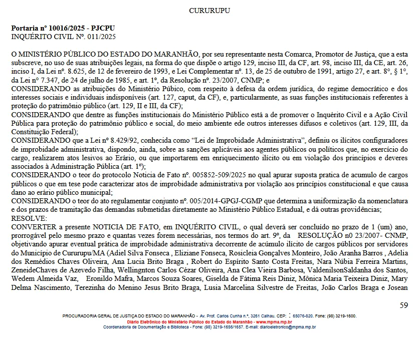 CURURUPU – O Ministério Público do Maranhão oficializou a abertura de um Inquérito Civil para investigar supostas irregularidades na gestão do prefeito Aldo Lopes (Republicanos). A investigação, conduzida pela Promotoria de Justiça de Cururupu, apura o acúmulo ilícito de cargos públicos por 22 servidores da administração municipal, o que pode configurar ato de improbidade administrativa.