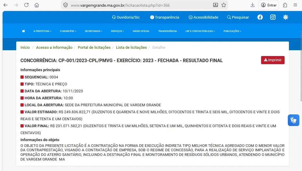 O Tribunal de Contas do Estado do Maranhão (TCE-MA) julgou procedente representação que apontou irregularidades na Concorrência Pública nº 001/2023 da Prefeitura de Vargem Grande, destinada à contratação de empresa para implantação e operação de aterro sanitário no município. A decisão resultou na aplicação de multa de R$ 10 mil ao presidente da Comissão Permanente de Licitação (CPL), Ricardo Barros Pereira.