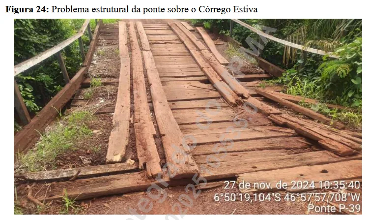 - Pontes em Situação de Risco: As vistorias, realizadas em novembro de 2024 , constataram que, apesar do contrato de R$ 2 milhões, a ponte sobre o Córrego Estiva () e a sobre o Rio Itaueira – Luís Josino () foram classificadas como em estado “EMERGENCIAL”, com risco iminente de colapso ou indício de instabilidade total da estrutura.