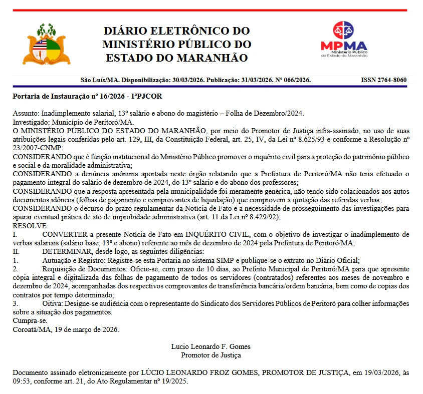 O Ministério Público do Estado do Maranhão (MPMA), por intermédio da Promotoria de Justiça de Coroatá, oficializou a abertura de um Inquérito Civil para apurar denúncias de irregularidades na folha de pagamento da Prefeitura de Peritoró. A investigação foca especificamente direto na gestão do Dr. Júnior por descumprimento do pagamento do salário de dezembro de 2024, do 13º salário e do abono dos professores.