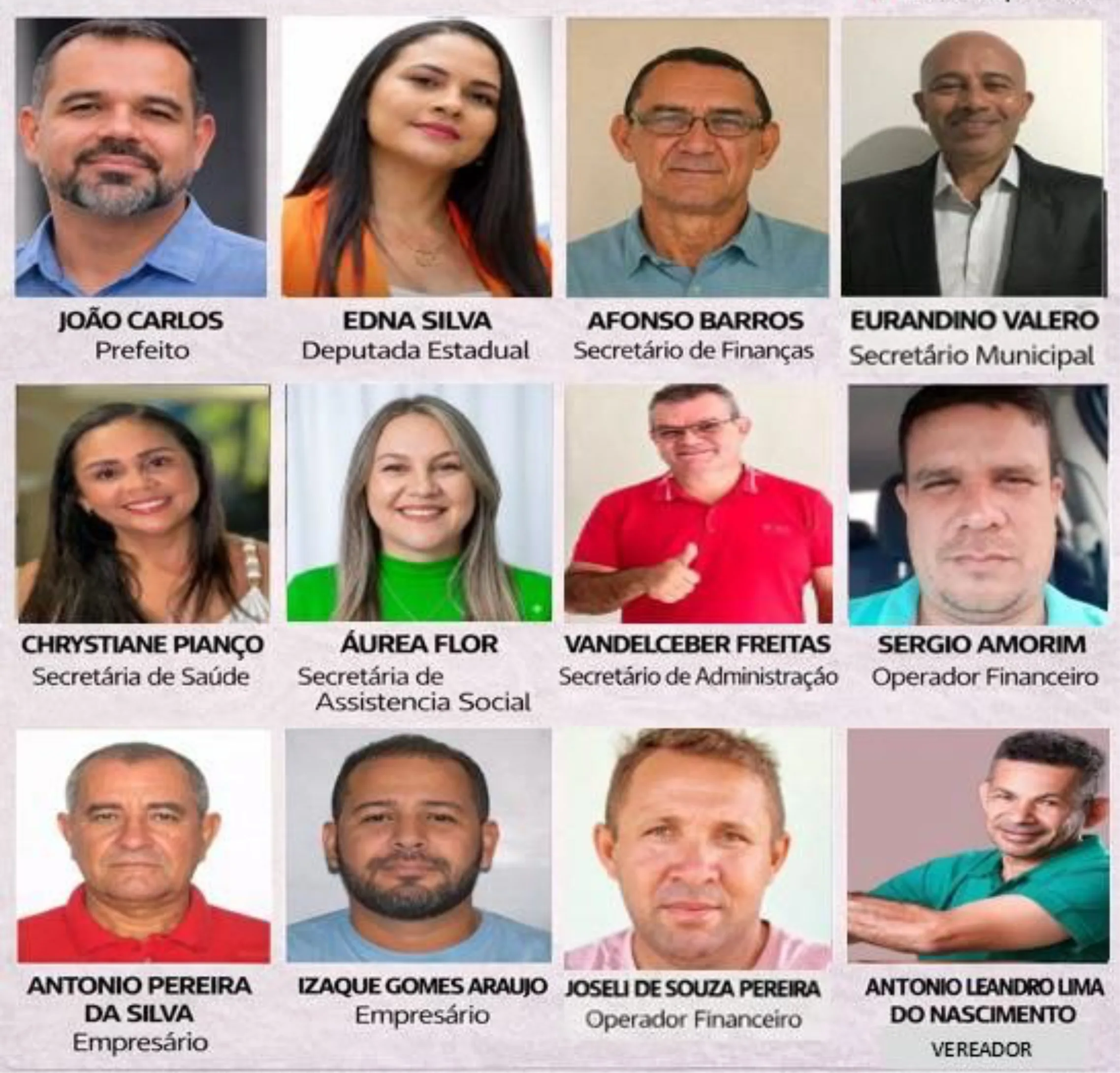 Além do prefeito e da deputada, também são citados na ação os secretários e agentes públicos Afonso Barros Batista, Vandecleber Freitas Silva, Christiane Piancó Lima, Áurea Cristina Costa Flor, Eurandino Valero Martins e Antonio Leandro Lima do Nascimento. No núcleo empresarial, aparecem o empresário Antonio Pereira da Silva, a empresa A. Pereira da Silva LTDA, além de Izaque Gomes Araújo e a Natuba Empreendimentos e Consultoria. Também são apontados como operadores financeiros Joseli de Souza Pereira e Sergio Soares de Amorim.