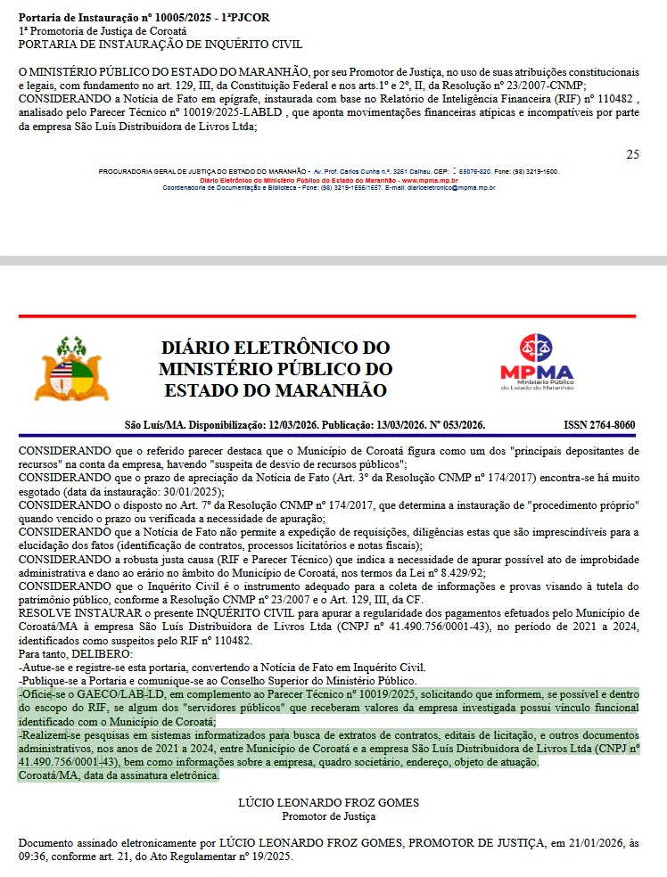 O Ministério Público do Estado do Maranhão instaurou um Inquérito Civil para investigar pagamentos realizados pela Prefeitura de Coroatá à empresa São Luís Distribuidora de Livros Ltda, após indícios de movimentações financeiras consideradas atípicas e incompatíveis.
