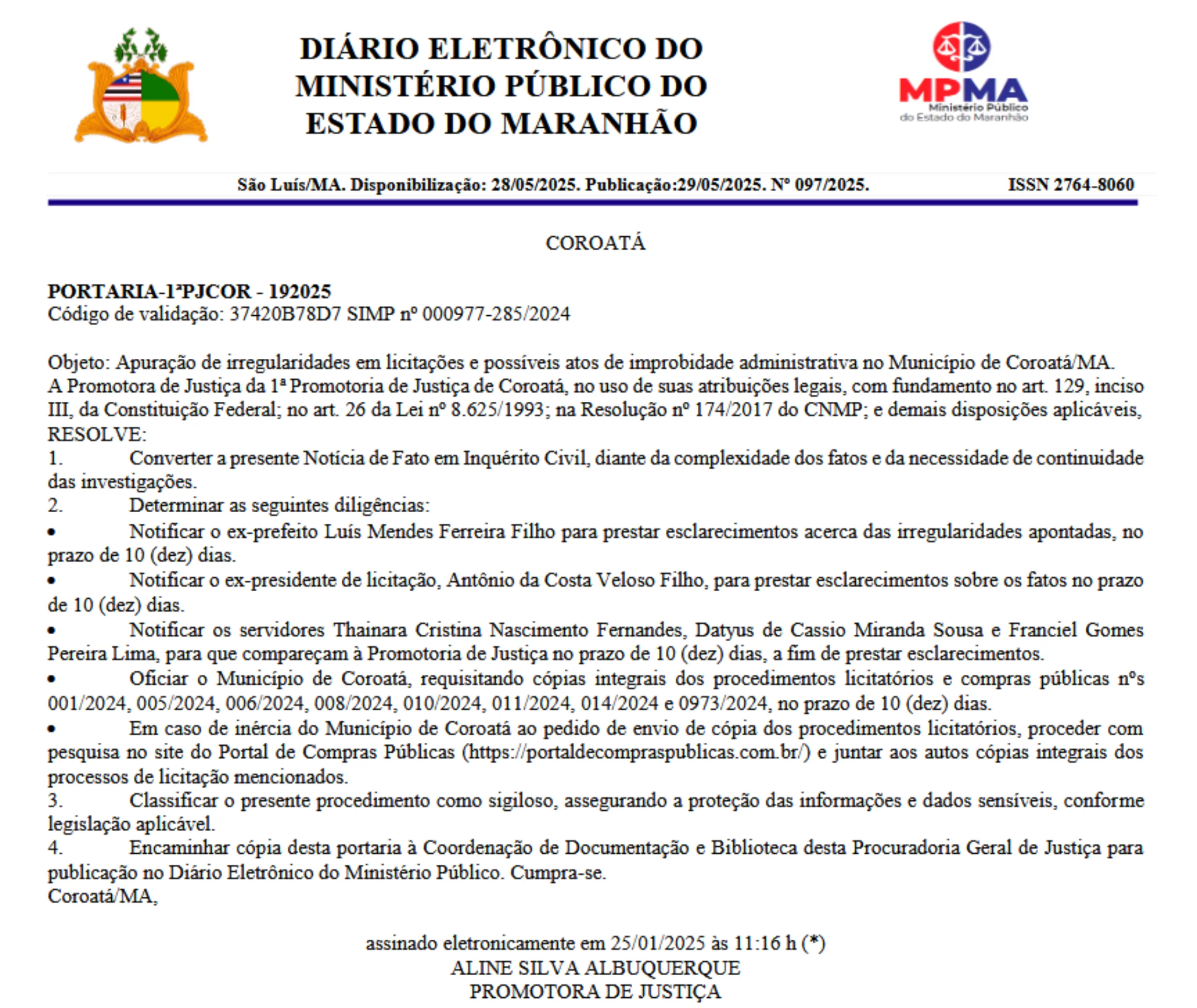 A 1ª Promotoria de Justiça de Coroatá (MA) instaurou um inquérito civil para apurar suspeitas de irregularidades em processos licitatórios e possíveis atos de improbidade administrativa no âmbito da administração pública municipal. A decisão, assinada pela promotora de Justiça Aline Silva Albuquerque, foi publicada no Diário Eletrônico do Ministério Público em 25 de janeiro de 2025.