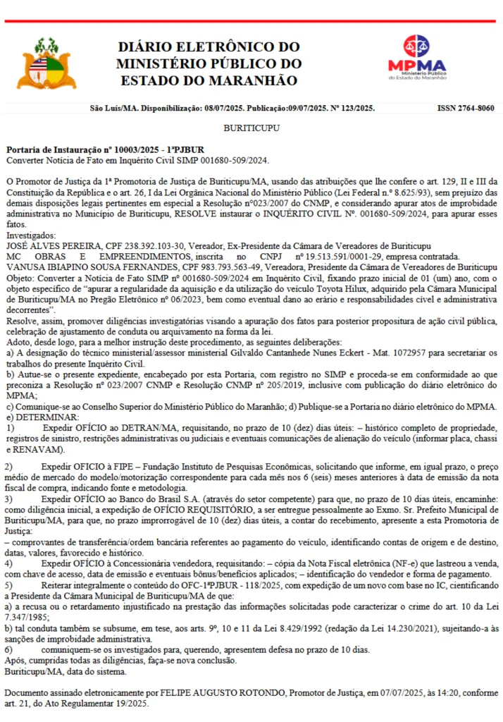 O Ministério Público do Maranhão (MPMA) instaurou um inquérito civil para investigar possíveis irregularidades na aquisição de uma caminhonete Toyota Hilux pela Câmara Municipal de Buriticupu, localizada no interior do estado. A medida foi formalizada por meio da Portaria de Instauração nº 10003/2025, assinada pelo promotor de Justiça Felipe Augusto Rotondo, da 1ª Promotoria de Justiça de Buriticupu.