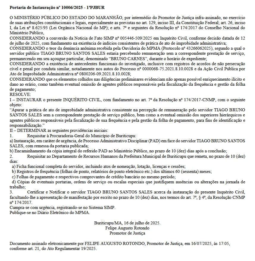 O Ministério Público do Maranhão (MPMA) instaurou um Inquérito Civil para apurar a conduta do servidor público Tiago Bruno Santos Sales, suspeito de receber remuneração sem exercer suas funções na Prefeitura de Buriticupu. A investigação foi formalizada por meio da Portaria de Instauração nº 10006/2025, assinada pelo promotor de Justiça Felipe Augusto Rotondo.