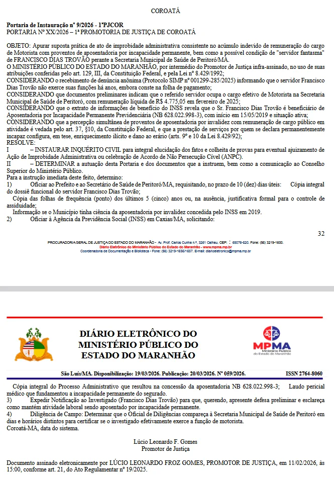 A 1ª Promotoria de Justiça de Coroatá formalizou a abertura de uma investigação contra o servidor Francisco Dias Trovão, lotado na Secretaria Municipal de Saúde de Peritoró. A suspeita é de que o funcionário esteja cometendo atos de improbidade administrativa ao acumular indevidamente salários da prefeitura com uma aposentadoria por invalidez, além de haver indícios de que ele atue como “servidor fantasma”.