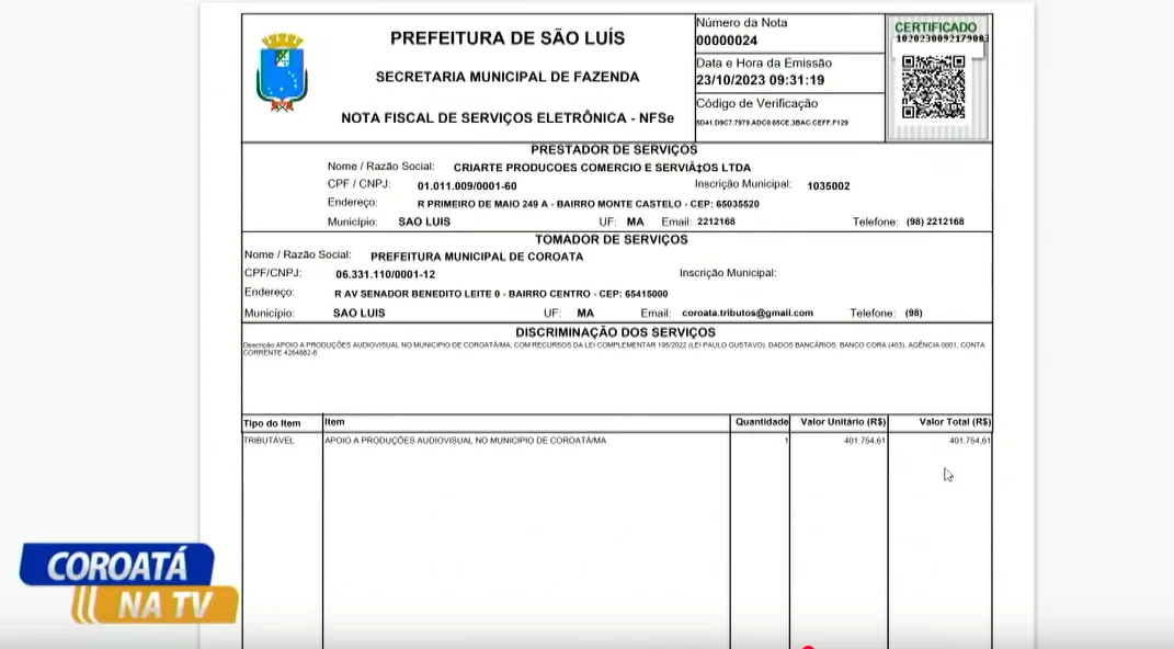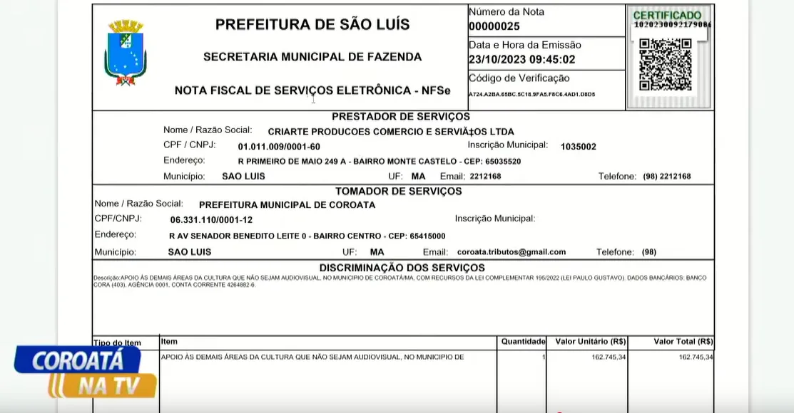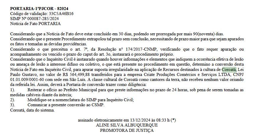 O Ministério Público do Maranhão (MPMA) abriu um inquérito civil para apurar possíveis irregularidades no uso dos recursos da Lei Paulo Gustavo destinados à cultura de Coroatá, durante a gestão do ex-prefeito Luís da Amovelar Filho. De acordo com a portaria, a empresa Criate Produções, sediada em São Luís, teria recebido R$ 564.499,88 para ações culturais, mas representantes da classe artística local afirmam não ter se beneficiado dos recursos.