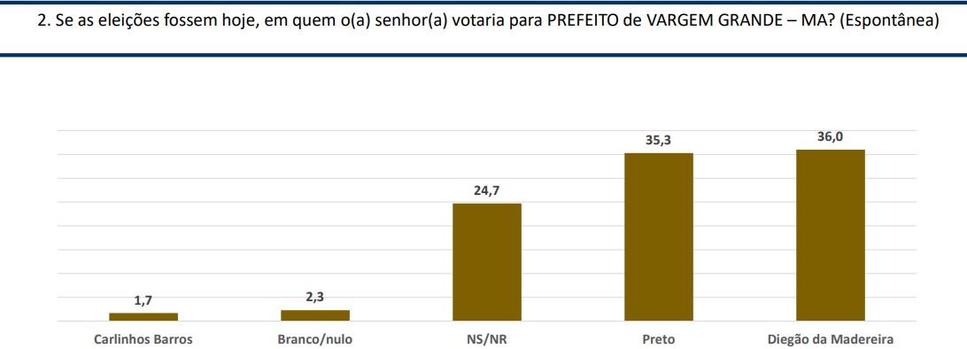 No cenário espontâneo, o pré-candidato Diegão da Madereira lidera com 36% das intenções de voto, seguido de perto por Preto, que soma 35,3%. Os eleitores que não souberam ou não responderam representam 24,7% do total, enquanto os votos em branco e nulos somam 2,3% e Carlinhos Barros aparece com 1,7%.