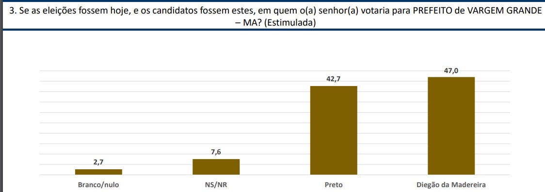 No cenário estimulado, Diegão da Madereira amplia sua vantagem com 47% das intenções de voto, enquanto Preto aparece em segundo lugar com 42,7%. A parcela de eleitores que não souberam ou não responderam é de 7,6%, e os votos brancos somam 2,7%.