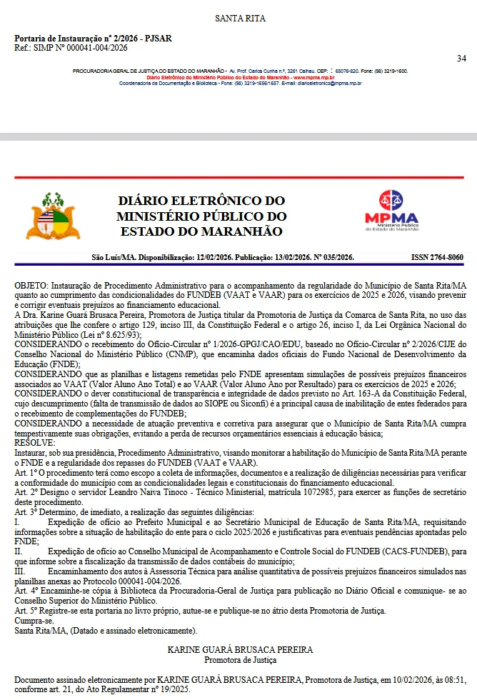 A medida foi formalizada por meio da Portaria de Instauração nº 2/2026 – PJSAR, assinada eletronicamente em 10 de fevereiro de 2026 pela promotora de Justiça Karine Guará Brusaca Pereira.