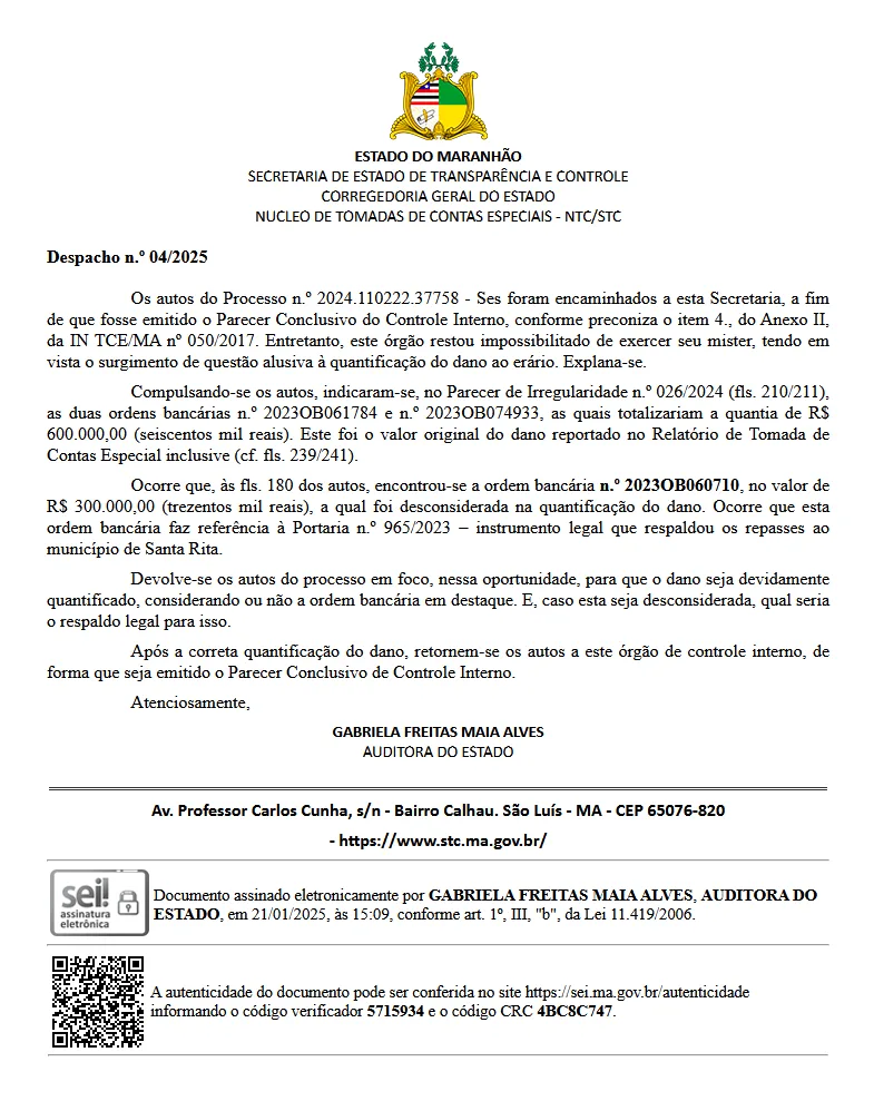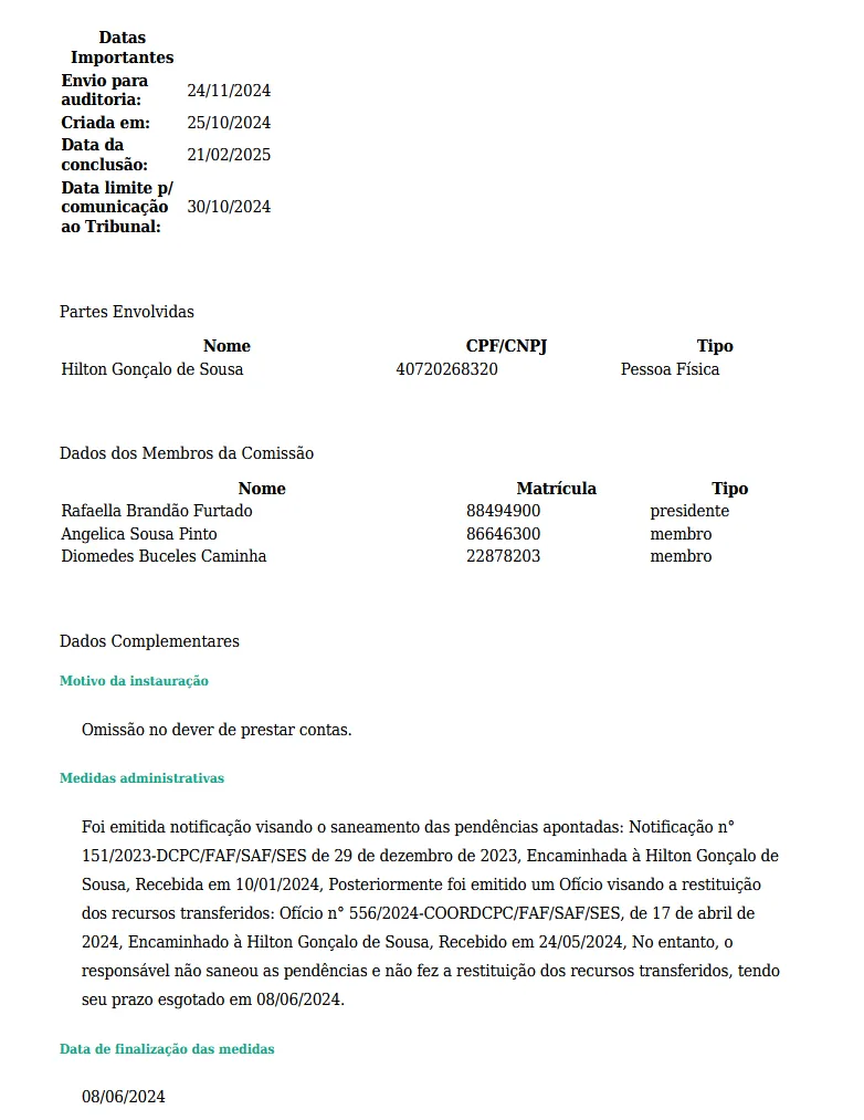 O processo (nº 1518/2025) teve origem em uma Tomada de Contas Especial instaurada pela SES após o município não apresentar a prestação de contas dentro do prazo legal. Foram repassadas duas parcelas de R$ 300 mil, totalizando R$ 600 mil, sem que houvesse comprovação de sua utilização.