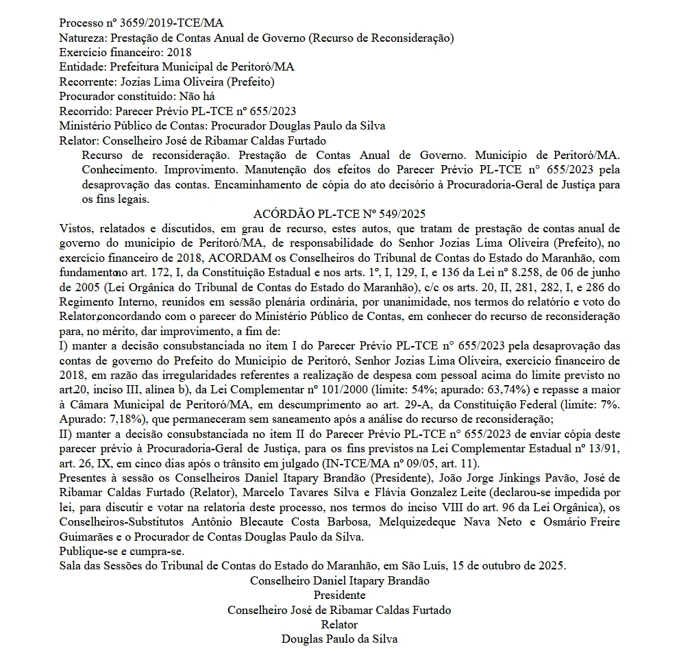 O Tribunal de Contas do Estado do Maranhão (TCE/MA) negou provimento ao Recurso de Reconsideração interposto pelo ex-prefeito de Peritoró, Jozias Lima Oliveira, e manteve a desaprovação de suas contas de governo referentes ao exercício financeiro de 2018. A decisão unânime foi proferida no Acórdão PL-TCE Nº 549/2025, na sessão plenária ordinária de 15 de outubro de 2025.