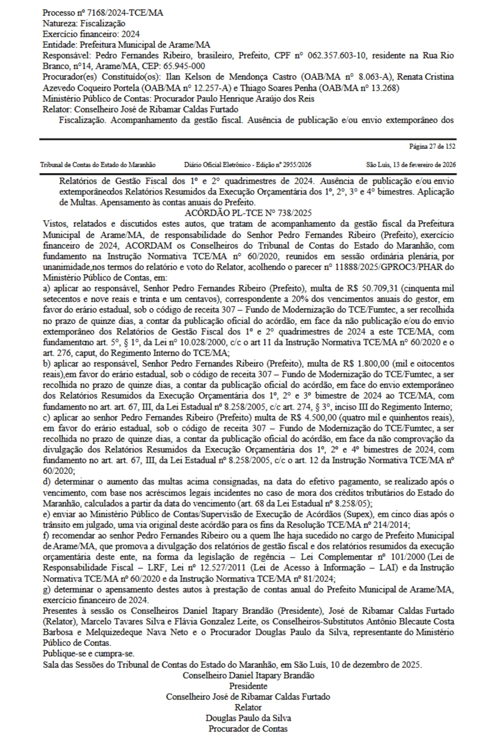 O Tribunal de Contas do Estado do Maranhão (TCE-MA) aplicou multas que somam R$ 57.009,31 ao prefeito de Arame, Pedro Fernandes Ribeiro, por falhas na transparência da gestão fiscal relativas ao exercício financeiro de 2024. A decisão foi tomada por unanimidade durante sessão plenária realizada em 10 de dezembro de 2025, em São Luís.