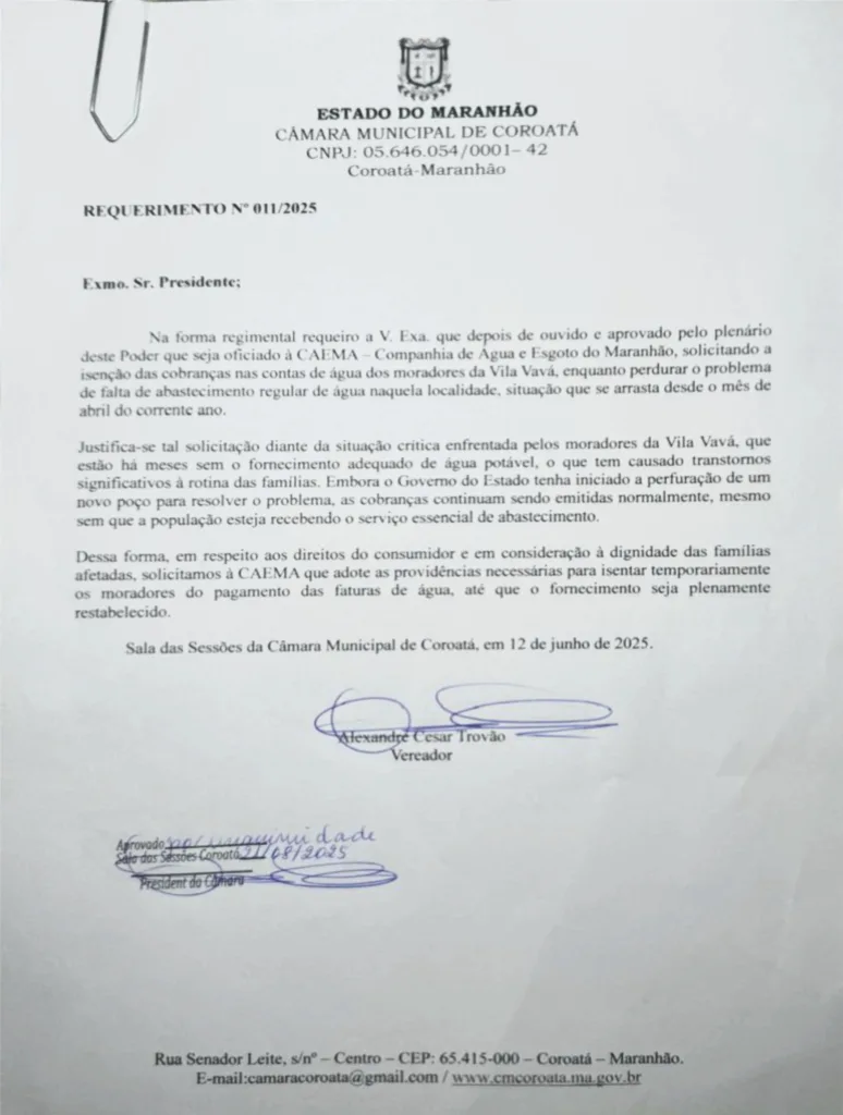 O vereador Alexandre César Trovão apresentou, na sessão do dia 21 de agosto de 2025, um requerimento aprovado pelo plenário da Câmara Municipal de Coroatá solicitando providências à Companhia de Água e Esgoto do Maranhão (CAEMA). O pedido visa isentar as cobrança das contas de água dos moradores da Vila Vavá, que enfrentam problemas no abastecimento desde o mês de abril.